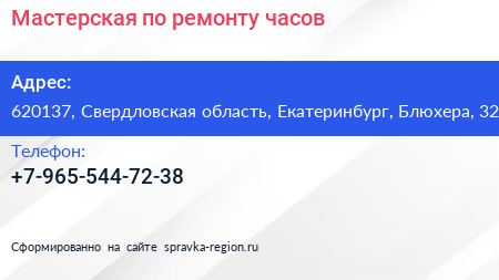 Мастерская по ремонту часов по адресу 620137, Свердловская область, Екатеринбург, Блюхера, 32 в дальнейшем Организация, размещена в следующих категориях: