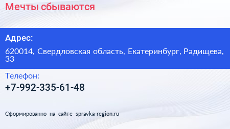 Мечты сбываются по адресу 620014, Свердловская область, Екатеринбург, Радищева, 33 в дальнейшем Организация, размещена в следующих категориях: