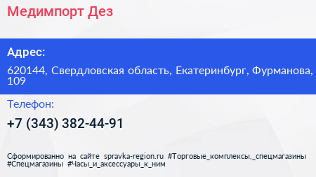 Медимпорт-Дез по адресу 620144, Свердловская область, Екатеринбург, Фурманова, 109 в дальнейшем Организация, размещена в следующих категориях: