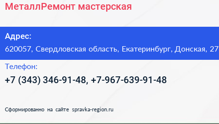МеталлРемонт, мастерская по адресу 620057, Свердловская область, Екатеринбург, Донская, 27 в дальнейшем Организация, размещена в следующих категориях: