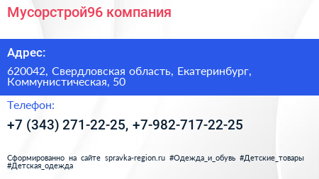 Мусорстрой96, компания по адресу 620042, Свердловская область, Екатеринбург, Коммунистическая, 50 в дальнейшем Организация, размещена в следующих категориях: