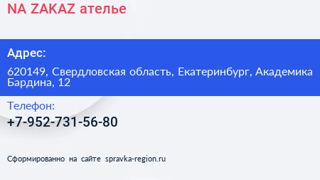 NA-ZAKAZ, ателье по адресу 620149, Свердловская область, Екатеринбург, Академика Бардина, 12 в дальнейшем Организация, размещена в следующих категориях: