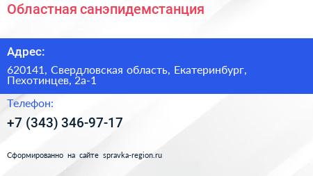 Областная санэпидемстанция по адресу 620141, Свердловская область, Екатеринбург, Пехотинцев, 2а-1 в дальнейшем Организация, размещена в следующих категориях: