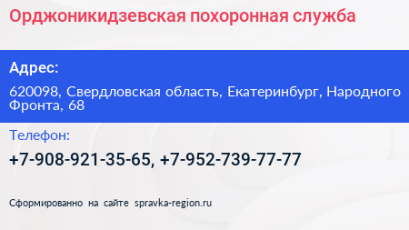 Орджоникидзевская похоронная служба по адресу 620098, Свердловская область, Екатеринбург, Народного Фронта, 68 в дальнейшем Организация, размещена в следующих категориях: