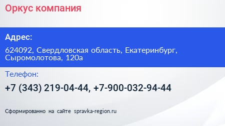 Оркус, компания по адресу 624092, Свердловская область, Екатеринбург, Сыромолотова, 120а в дальнейшем Организация, размещена в следующих категориях: