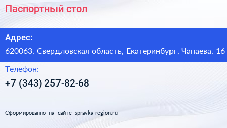 Паспортный стол по адресу 620063, Свердловская область, Екатеринбург, Чапаева, 16 в дальнейшем Организация, размещена в следующих категориях: