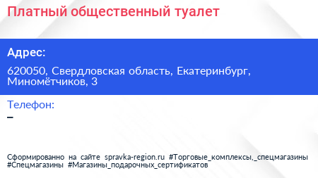 Платный общественный туалет по адресу 620050, Свердловская область, Екатеринбург, Миномётчиков, 3 в дальнейшем Организация, размещена в следующих категориях: