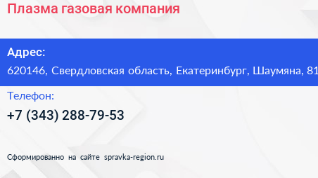 Плазма, газовая компания по адресу 620146, Свердловская область, Екатеринбург, Шаумяна, 81 в дальнейшем Организация, размещена в следующих категориях: