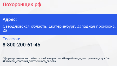 Похоронщик.рф по адресу Свердловская область, Екатеринбург, Западная промзона, 2а в дальнейшем Организация, размещена в следующих категориях: