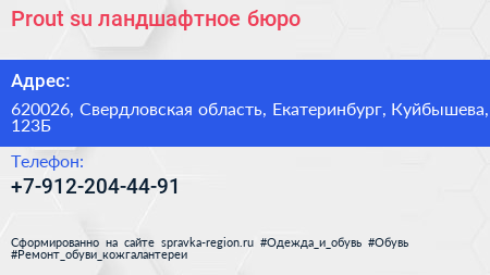 Prout.su, ландшафтное бюро по адресу 620026, Свердловская область, Екатеринбург, Куйбышева, 123Б в дальнейшем Организация, размещена в следующих категориях: