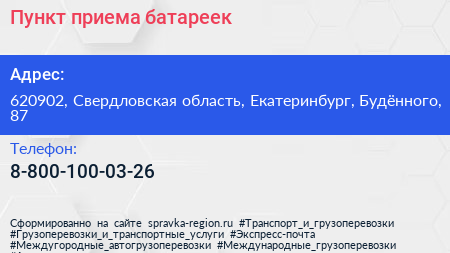Пункт приема батареек по адресу 620902, Свердловская область, Екатеринбург, Будённого, 87 в дальнейшем Организация, размещена в следующих категориях: