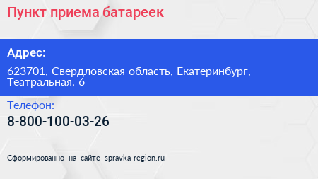 Пункт приема батареек по адресу 623701, Свердловская область, Екатеринбург, Театральная, 6 в дальнейшем Организация, размещена в следующих категориях: