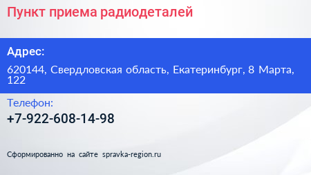 Пункт приема радиодеталей по адресу 620144, Свердловская область, Екатеринбург, 8 Марта, 122 в дальнейшем Организация, размещена в следующих категориях: