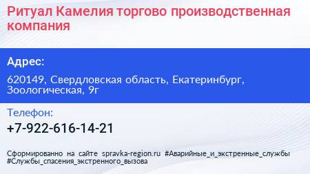 Ритуал Камелия, торгово-производственная компания по адресу 620149, Свердловская область, Екатеринбург, Зоологическая, 9г в дальнейшем Организация, размещена в следующих категориях: