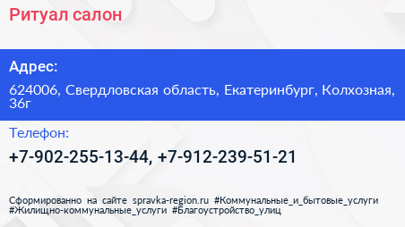 Ритуал, салон по адресу 624006, Свердловская область, Екатеринбург, Колхозная, 36г в дальнейшем Организация, размещена в следующих категориях: