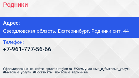 Родники по адресу Свердловская область, Екатеринбург, Родники снт, 44 в дальнейшем Организация, размещена в следующих категориях: