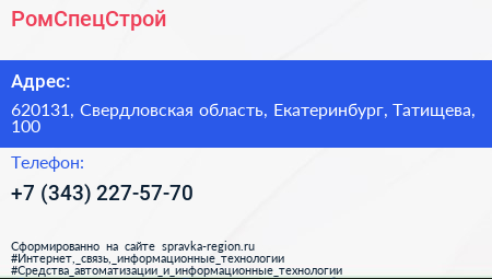 РомСпецСтрой по адресу 620131, Свердловская область, Екатеринбург, Татищева, 100 в дальнейшем Организация, размещена в следующих категориях:
