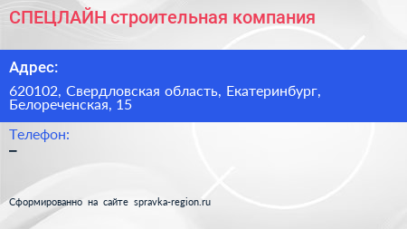 СПЕЦЛАЙН, строительная компания по адресу 620102, Свердловская область, Екатеринбург, Белореченская, 15 в дальнейшем Организация, размещена в следующих категориях: