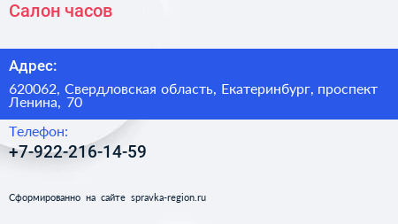Салон часов по адресу 620062, Свердловская область, Екатеринбург, проспект Ленина, 70 в дальнейшем Организация, размещена в следующих категориях: