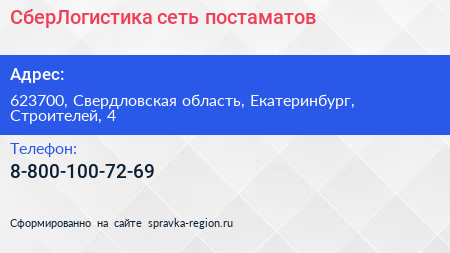 СберЛогистика, сеть постаматов по адресу 623700, Свердловская область, Екатеринбург, Строителей, 4 в дальнейшем Организация, размещена в следующих категориях:
