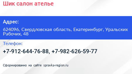 Шик, салон-ателье по адресу 624096, Свердловская область, Екатеринбург, Уральских Рабочих, 48 в дальнейшем Организация, размещена в следующих категориях:
