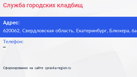 Служба городских кладбищ по адресу 620062, Свердловская область, Екатеринбург, Блюхера, 6а в дальнейшем Организация, размещена в следующих категориях: