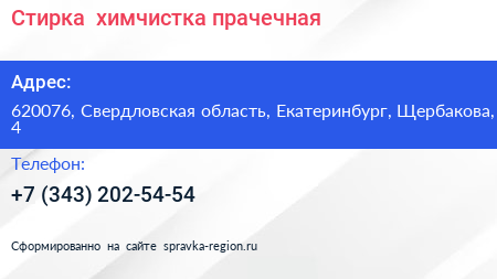 Стирка+, химчистка-прачечная по адресу 620076, Свердловская область, Екатеринбург, Щербакова, 4 в дальнейшем Организация, размещена в следующих категориях: