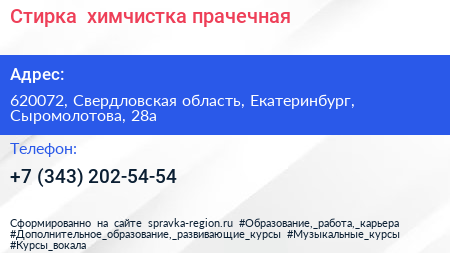 Стирка+, химчистка-прачечная по адресу 620072, Свердловская область, Екатеринбург, Сыромолотова, 28а в дальнейшем Организация, размещена в следующих категориях:
