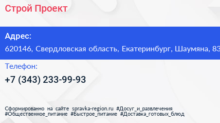 Строй-Проект по адресу 620146, Свердловская область, Екатеринбург, Шаумяна, 83 в дальнейшем Организация, размещена в следующих категориях: