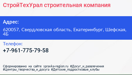 СтройТехУрал, строительная компания по адресу 620057, Свердловская область, Екатеринбург, Шефская, 4Б в дальнейшем Организация, размещена в следующих категориях: