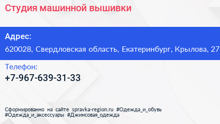 Студия машинной вышивки по адресу 620028, Свердловская область, Екатеринбург, Крылова, 27 в дальнейшем Организация, размещена в следующих категориях: