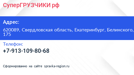 СуперГРУЗЧИКИ.рф по адресу 620089, Свердловская область, Екатеринбург, Белинского, 175 в дальнейшем Организация, размещена в следующих категориях: