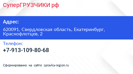 СуперГРУЗЧИКИ.рф по адресу 620091, Свердловская область, Екатеринбург, Краснофлотцев, 2 в дальнейшем Организация, размещена в следующих категориях: