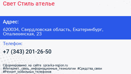 Свет-Стиль, ателье по адресу 620034, Свердловская область, Екатеринбург, Опалихинская, 23 в дальнейшем Организация, размещена в следующих категориях: