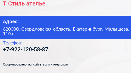 Т-Стиль, ателье по адресу 620000, Свердловская область, Екатеринбург, Малышева, 116а в дальнейшем Организация, размещена в следующих категориях: