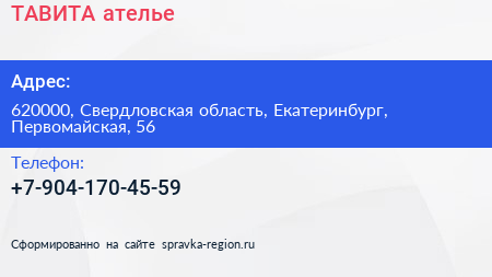 ТАВИТА, ателье по адресу 620000, Свердловская область, Екатеринбург, Первомайская, 56 в дальнейшем Организация, размещена в следующих категориях: