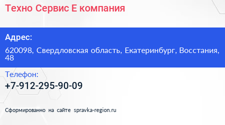 Техно Сервис-Е, компания по адресу 620098, Свердловская область, Екатеринбург, Восстания, 48 в дальнейшем Организация, размещена в следующих категориях: