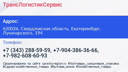 ТрансЛогистикСервис по адресу 620026, Свердловская область, Екатеринбург, Луначарского, 194 в дальнейшем Организация, размещена в следующих категориях: