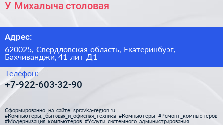 У Михалыча, столовая по адресу 620025, Свердловская область, Екатеринбург, Бахчиванджи, 41 лит Д1 в дальнейшем Организация, размещена в следующих категориях: