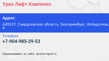 Урал Лифт Комплекс по адресу 620137, Свердловская область, Екатеринбург, Аппаратная, 4 в дальнейшем Организация, размещена в следующих категориях: