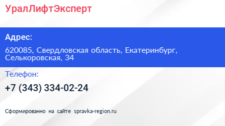 УралЛифтЭксперт по адресу 620085, Свердловская область, Екатеринбург, Селькоровская, 34 в дальнейшем Организация, размещена в следующих категориях: