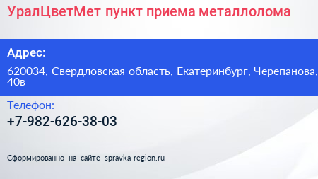 УралЦветМет, пункт приема металлолома по адресу 620034, Свердловская область, Екатеринбург, Черепанова, 40в в дальнейшем Организация, размещена в следующих категориях: