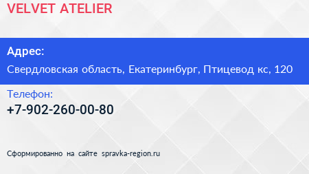 VELVET ATELIER по адресу Свердловская область, Екатеринбург, Птицевод кс, 120 в дальнейшем Организация, размещена в следующих категориях: