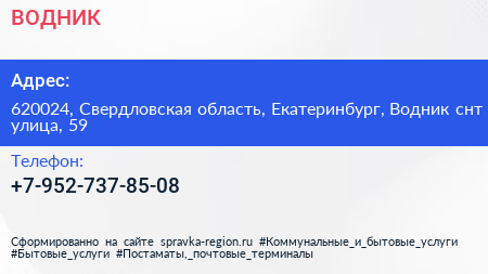 ВОДНИК по адресу 620024, Свердловская область, Екатеринбург, Водник снт улица, 59 в дальнейшем Организация, размещена в следующих категориях: