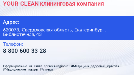 YOUR CLEAN, клининговая компания по адресу 620078, Свердловская область, Екатеринбург, Библиотечная, 43 в дальнейшем Организация, размещена в следующих категориях: