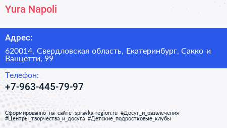 Yura Napoli по адресу 620014, Свердловская область, Екатеринбург, Сакко и Ванцетти, 99 в дальнейшем Организация, размещена в следующих категориях:
