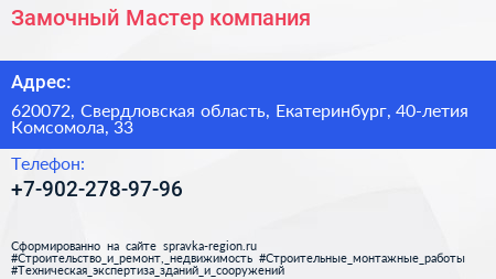 Замочный Мастер, компания по адресу 620072, Свердловская область, Екатеринбург, 40-летия Комсомола, 33 в дальнейшем Организация, размещена в следующих категориях: