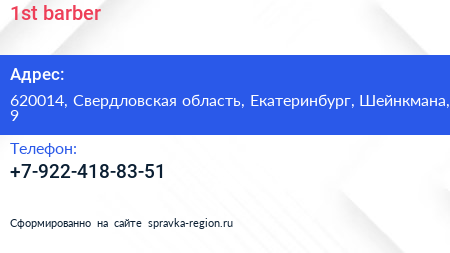 1st barber по адресу 620014, Свердловская область, Екатеринбург, Шейнкмана, 9 в дальнейшем Организация, размещена в следующих категориях: