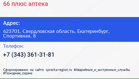 66 плюс, аптека по адресу 623701, Свердловская область, Екатеринбург, Спортивная, 8 в дальнейшем Организация, размещена в следующих категориях: