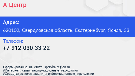 А-Центр по адресу 620102, Свердловская область, Екатеринбург, Ясная, 33 в дальнейшем Организация, размещена в следующих категориях: